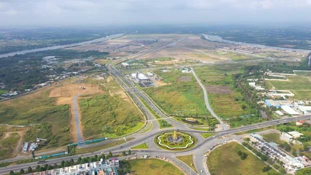 Vòng xoay trên trục đường DT 830, tuyến giao thông chiến lược của Bến Lức, Long An, vừa được nâng cấp mở rộng. ảnh : Dương Thắng